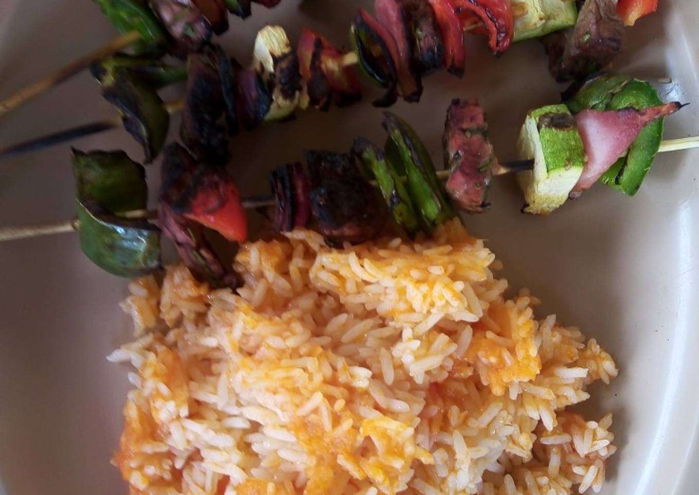 - Después vamos a armar nuestras brochetas alternando la carne y las verduras.