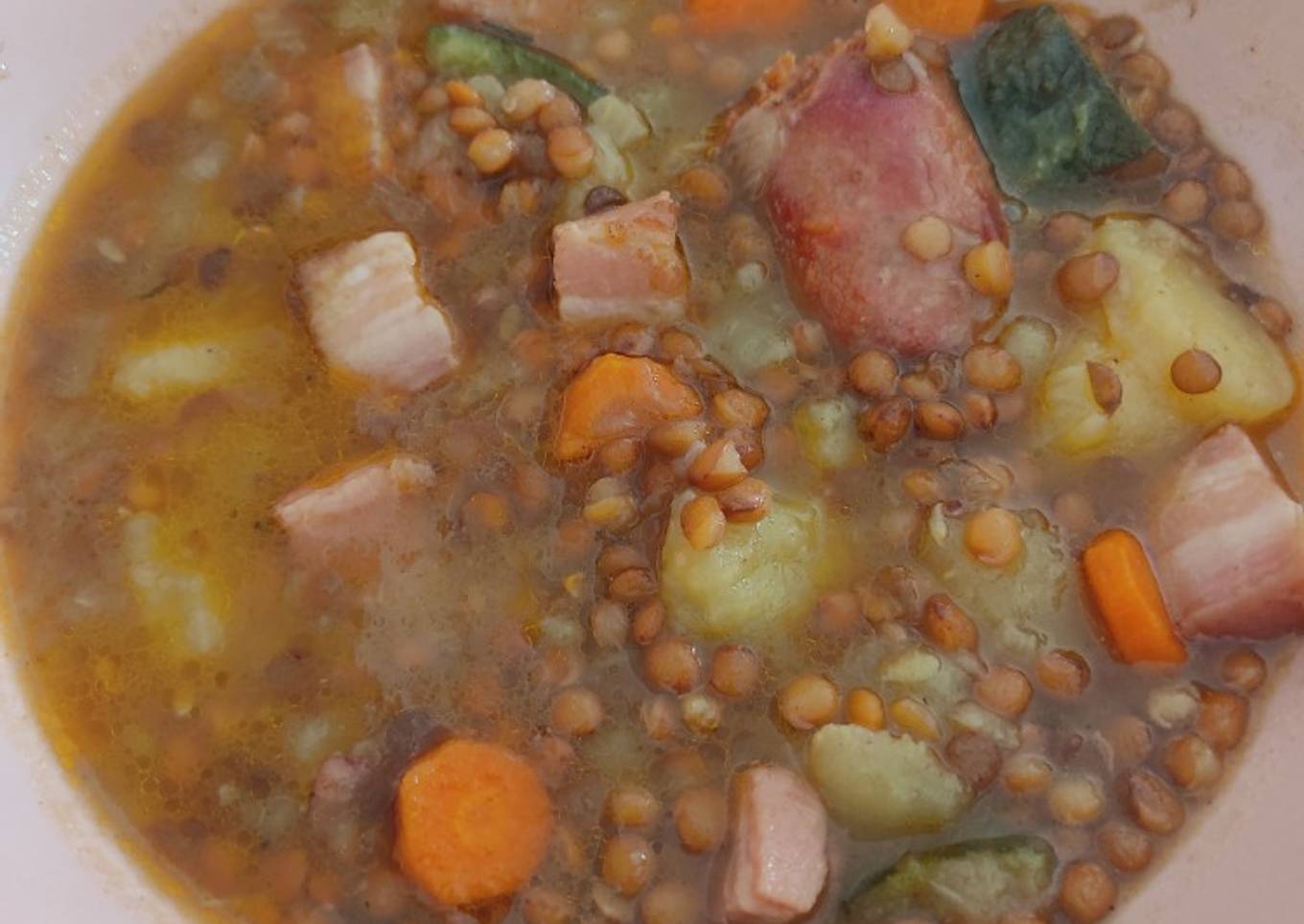 Lentejas de bote con verdura y chorizo, morcilla y patata