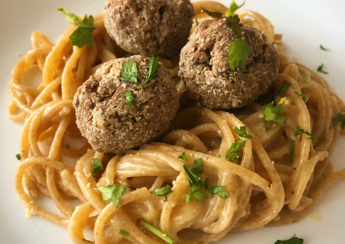 Espagueti integral con salsa de huevo y queso (y albóndigas de ternera, avena y mostaza)