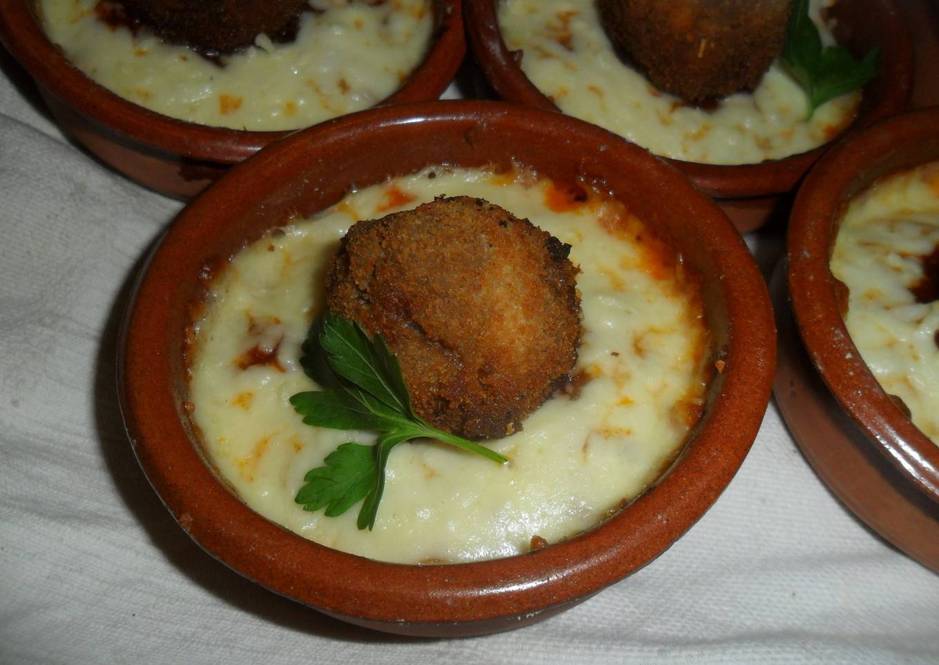 Albóndigas con napolitana gratinada en cazuelitas con brisa