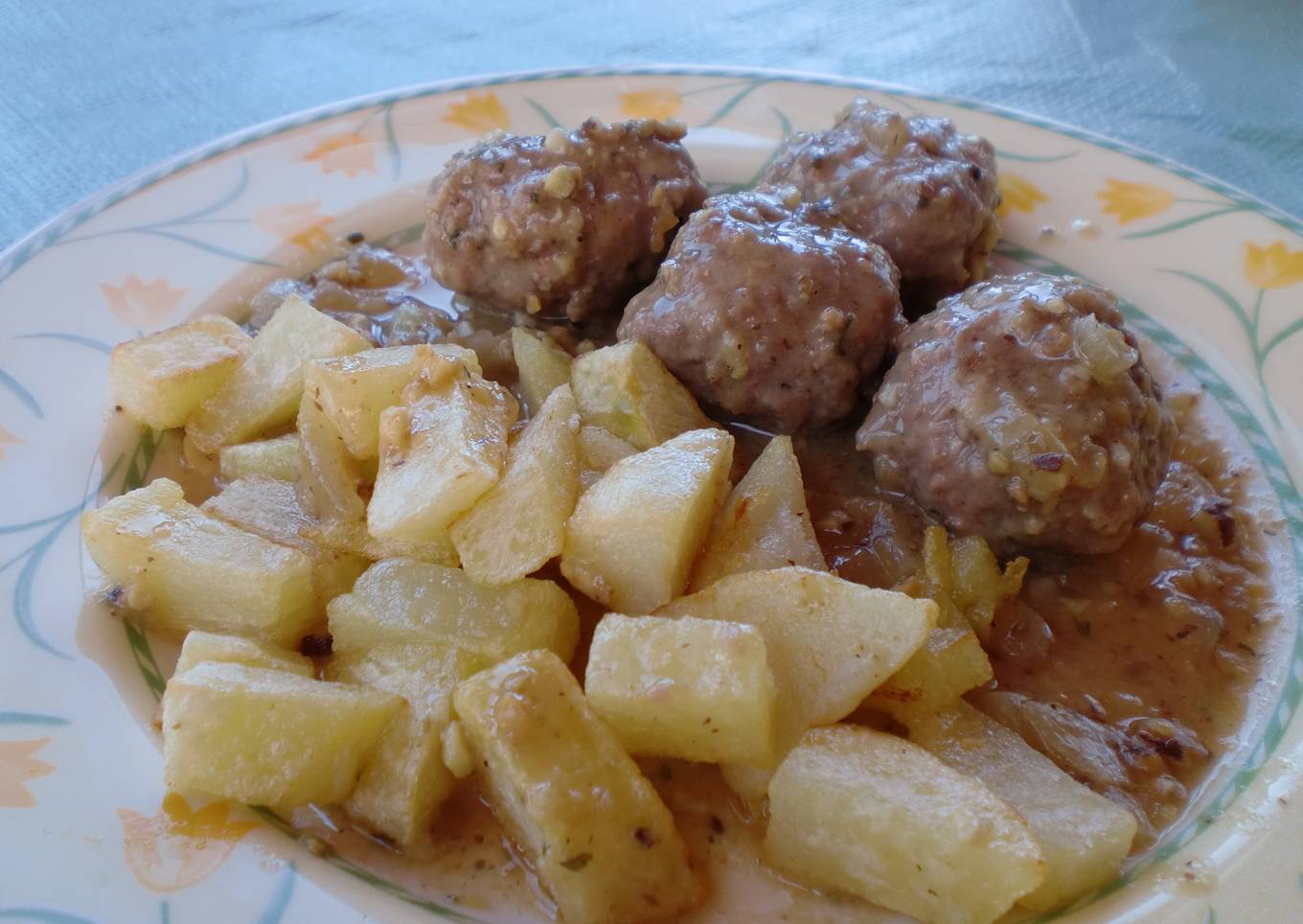 Unas deliciosas albóndigas en salsa de almendra con patatas fritas.