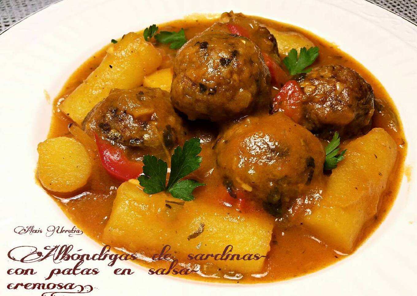 Albóndigas de sardinas, con patatas y crema de patatas guisadas,