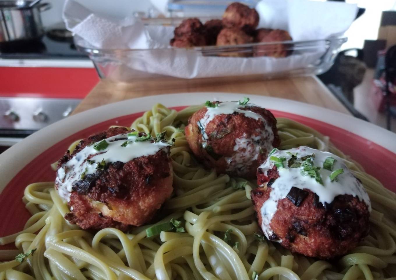- Servir con fideos a la crema, y verter un poquito de crema sobre las albóndigas y espolvorear cebollín picado y queso parmesano si gustas 💚