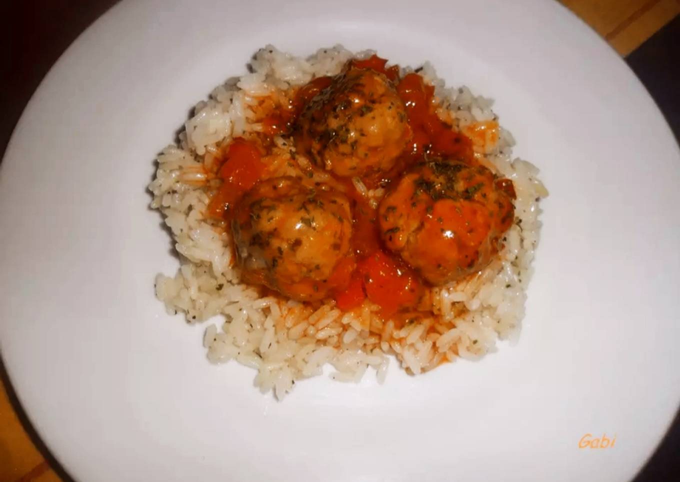 Un delicioso arroz blanco sofrito con ajo y cebollas picados, acompañado de albóndigas de ternera caseras cocinadas en una sabrosísima salsa de tomate.